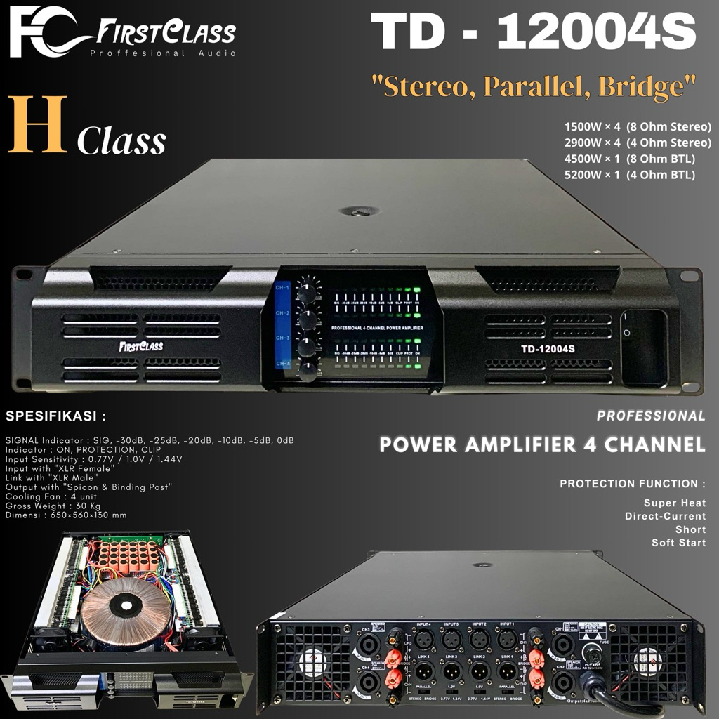 POWER AMPLIFIER FIRSTCLASS TD12004S / TD 12004S / TD12004 4CH 4X1500 WATT 4 KIPAS 24 PCS ELCO