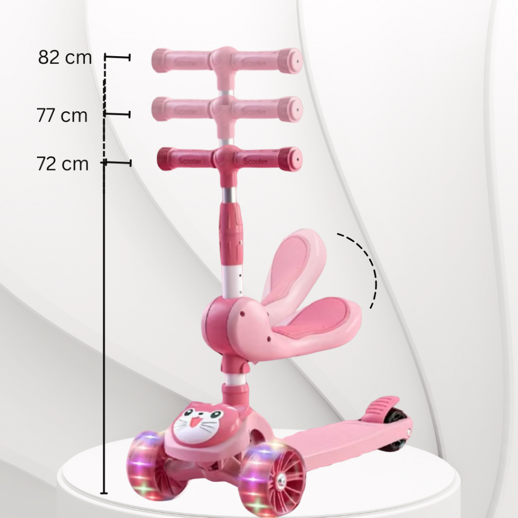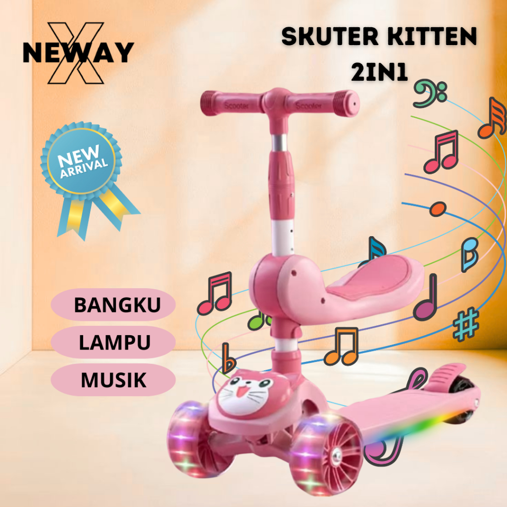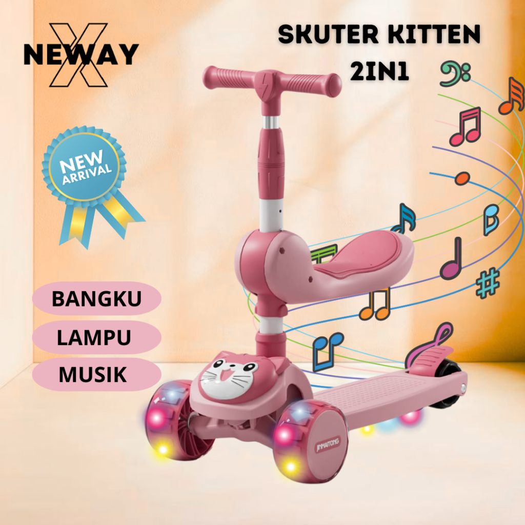 NewayX Skuter Mainan Anak Kucing Lucu 2 in 1 Scooter Lipat 2in1 Duduk Roda Tiga Lampu Musik Rem Toys