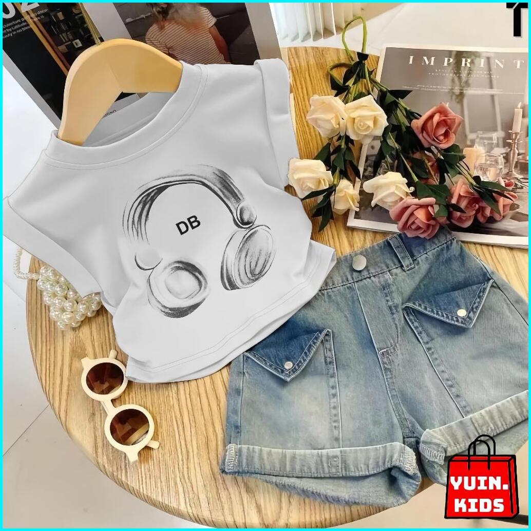 Setelan Anak Perempuan Lucu Motif Earphone Dbox Usia 1-5 Tahun Set Baju Kaos Anak Dan Celana Denim