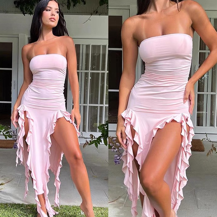 Strapless Ruffle Midi Dress With Side Split 2747 (S/M/L)