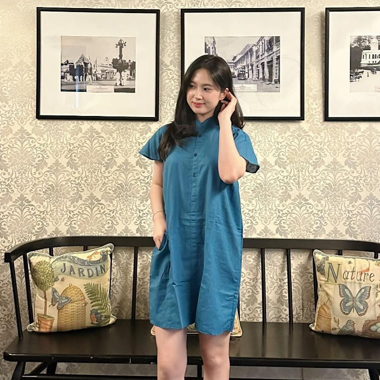 Laura Midi Dress Linen Mini Dress Casual Wanita Korea Style Lengan Pendek Polos Wanita Oversize Terbaru
