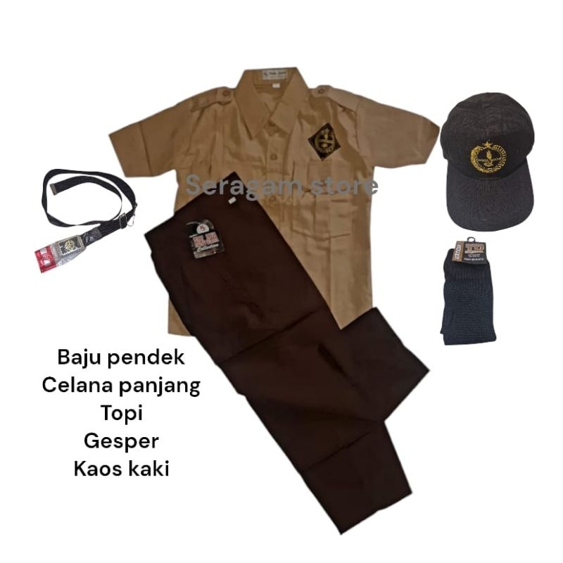 SERAGAM SD SETELAN SET PRAMUKA LENGKAP BAJU PENDEK, CELANA PANJANG, TOPI, GESPER, DAN KAOS KAKI