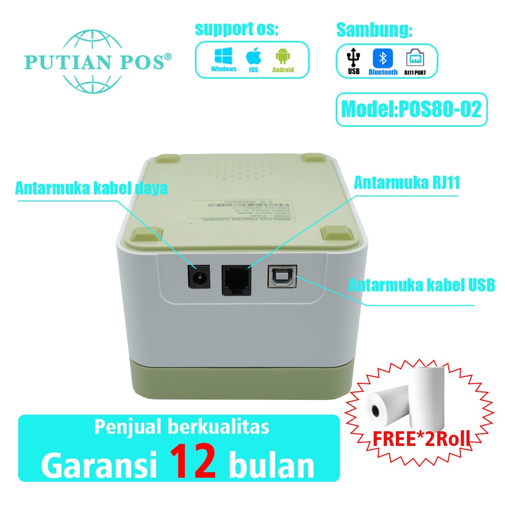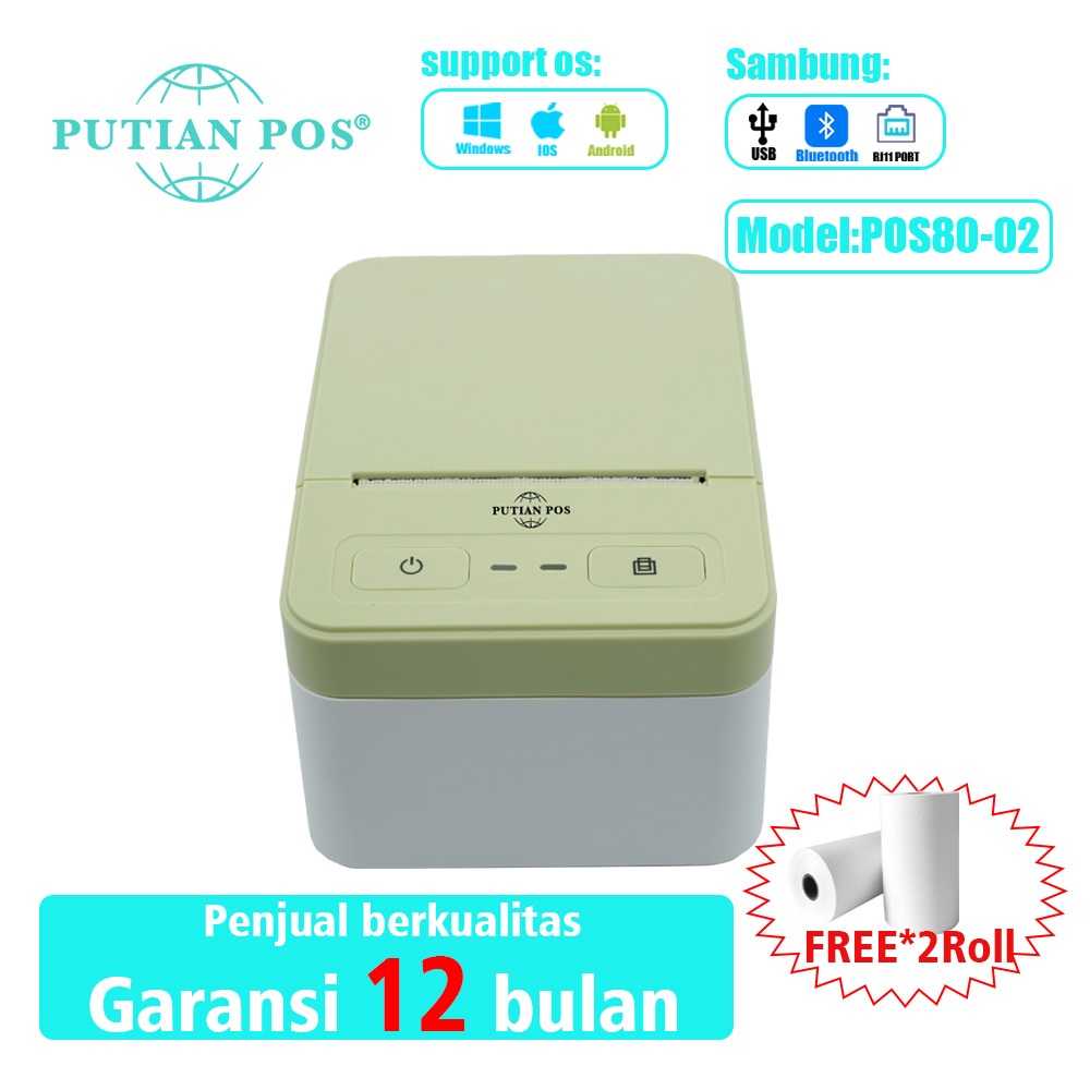 Printer Termal Bluetooth Desktop Putian Pos80-02 80Mm, Printer Struk Dan Label 2-In-1, Windows, Usb