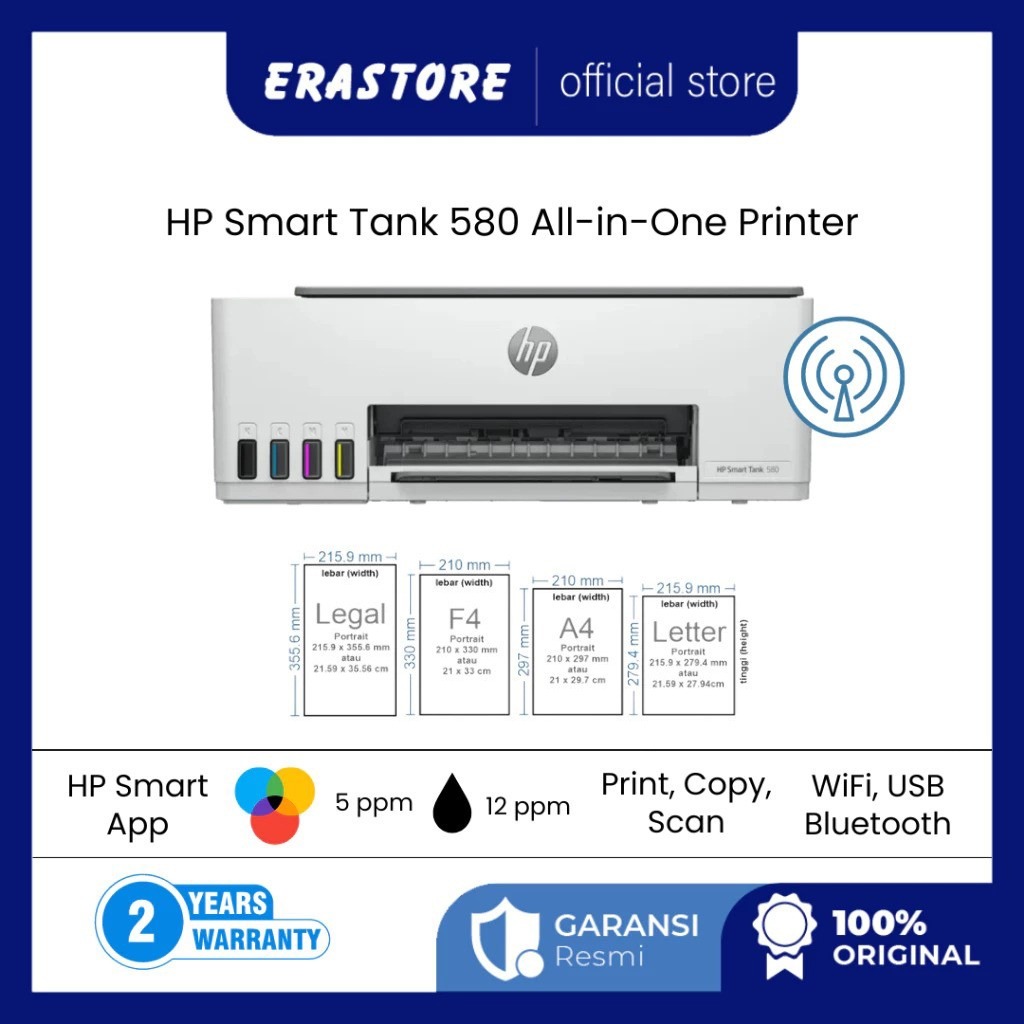 Erastore Hp Smart Tank 580 All-In-One Printer - Print, Scan, Copy Wi Fi Wifi Garansi Resmi 100 PERSEN Original (1F3Y2A)