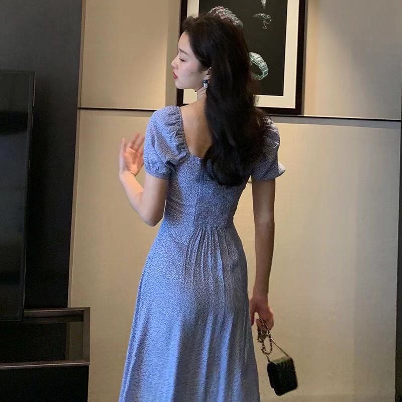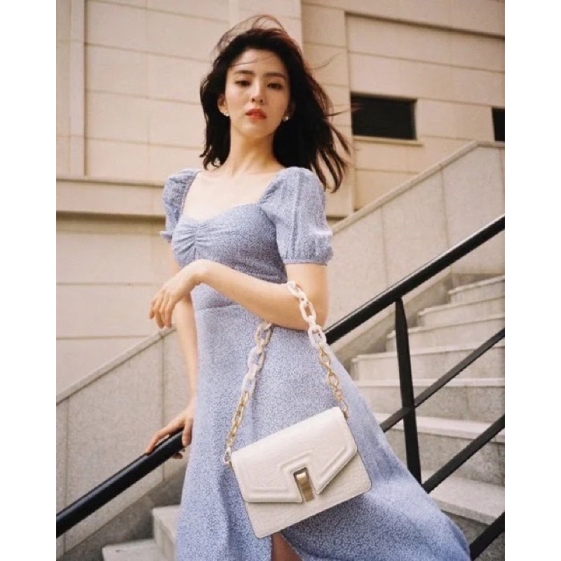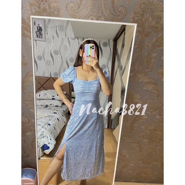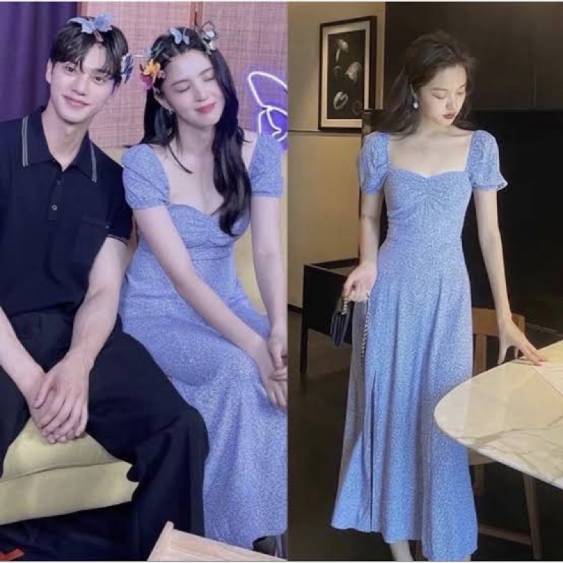 Han So Hee Midi Dress Square Neck Korean Style New Collection Nevertheless Casual Import / Gaun Wanita Murah Motif Polka