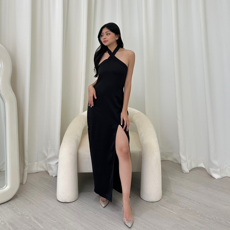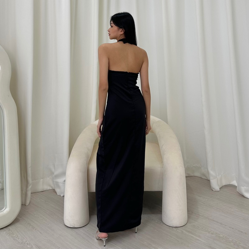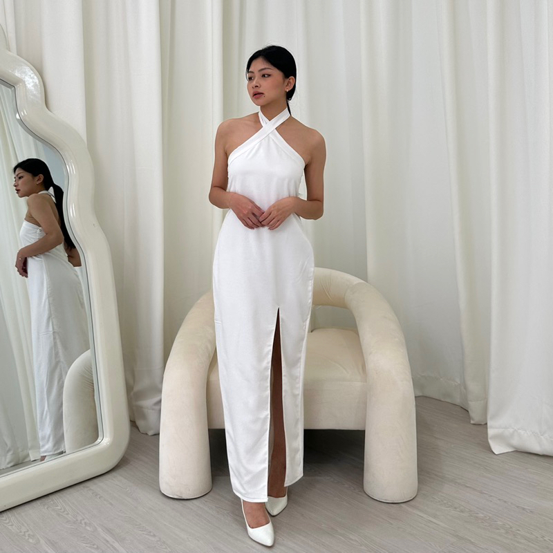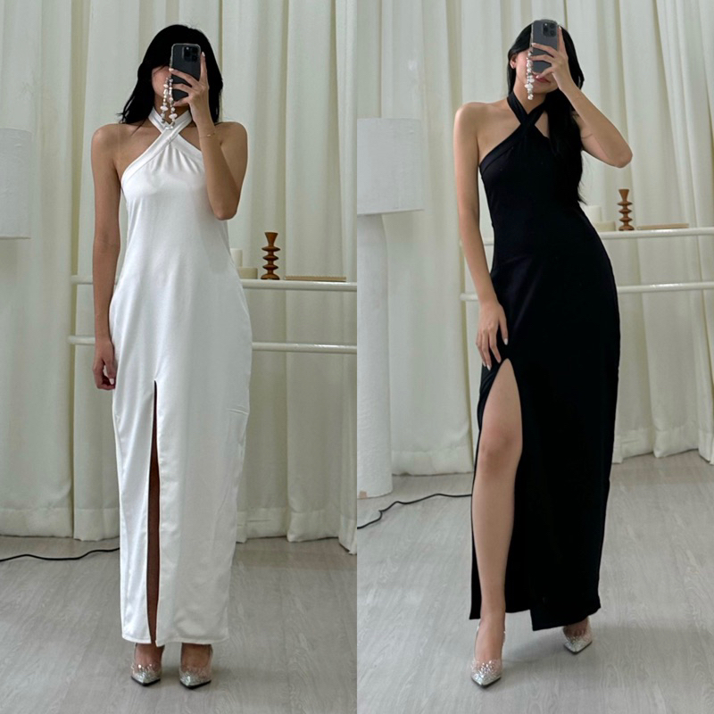 Scilla Dress | Rooha | Dress Panjang Wanita Satin Halter Neck Maxi Dress Korean Party Dress