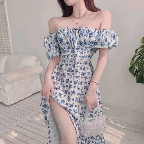Maxi White And Blue Floral Dress With Puffy Sleeve / Dress Casual Kasual / Summer Dress / Daisy Dress / Off Shoulder Dre