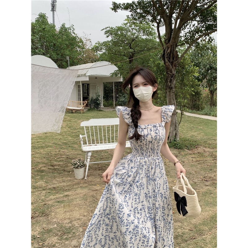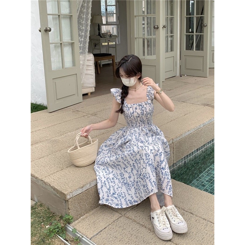 Butterfly Sleeve Blue Floral Midi Dress - Dress Casual Kasual / Daisy Dress Bunga Biru / Dress Pantai Holiday Beach Dres
