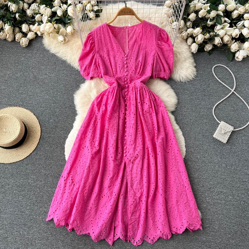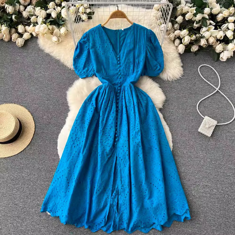 Korean Style Vintage Midi Dress Polos Eyelet Katbol Katun Bolong Natal