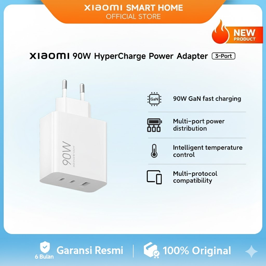 [Star] Xiaomi 90W HyperCharge Power Adapter 3-Port GaN Fast Charging Multi-Protocol Intelligent Temp Control Resmi