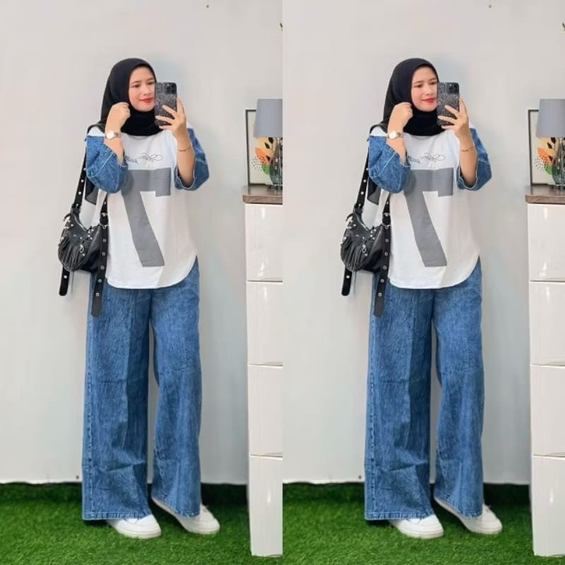 Setelan Jeans XL,XXL Wanita Dewasa Atasan Combed 24s Celana Jeans Kulot Cargo, Setelan Wanita Kekinian