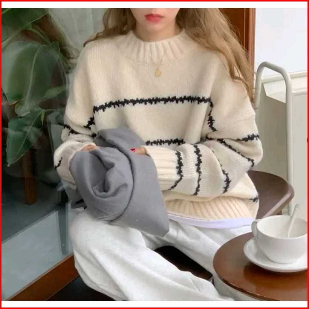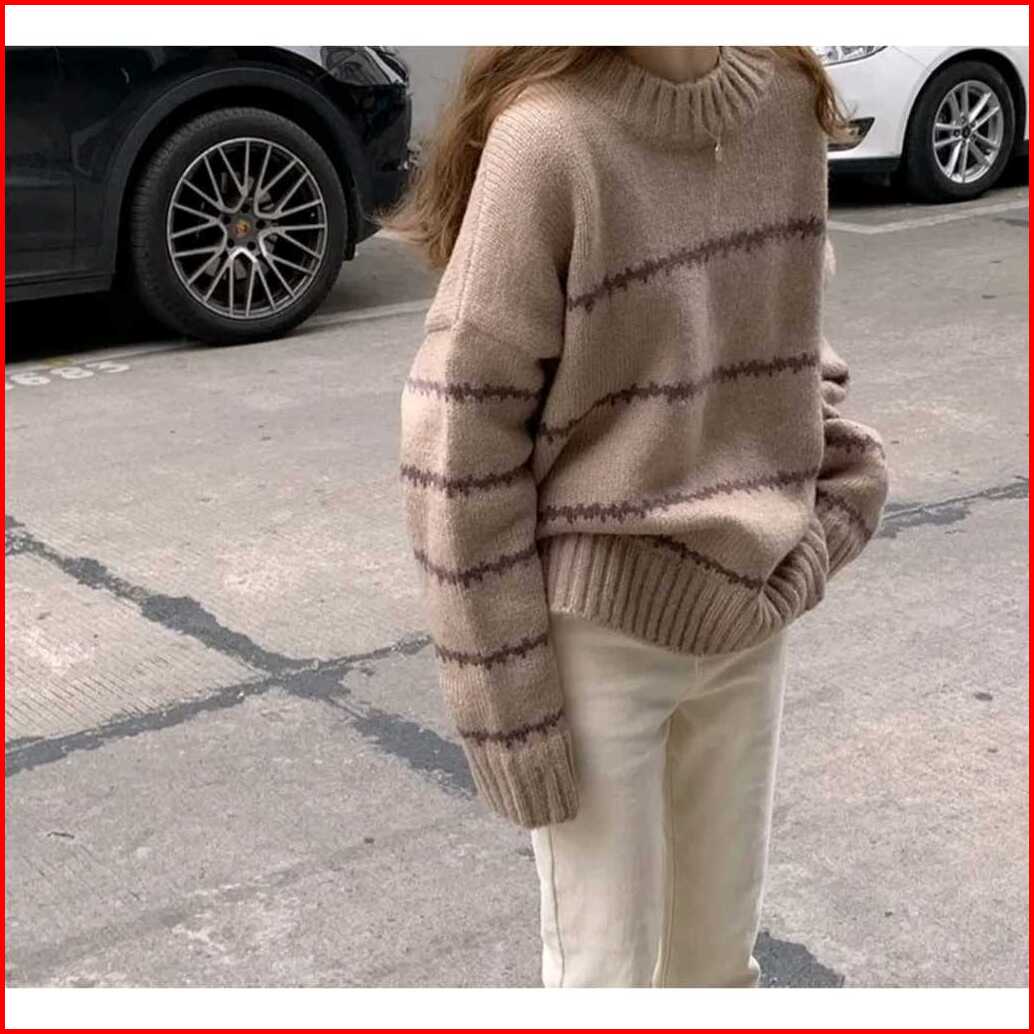 Sweater Pullover Leher Bulat Wanita Korean Style Bergaris Knitwear Top Oversize