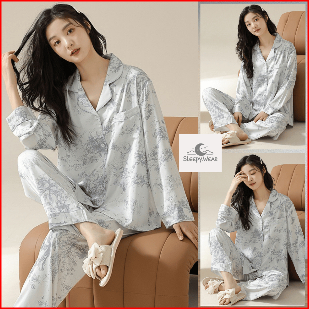 Sleepy Baju Tidur Lengan Panjang Setelan One Set Wanita Dewasa Motif Marble Paint Elegant Bahan Satin Premium Korea Styl