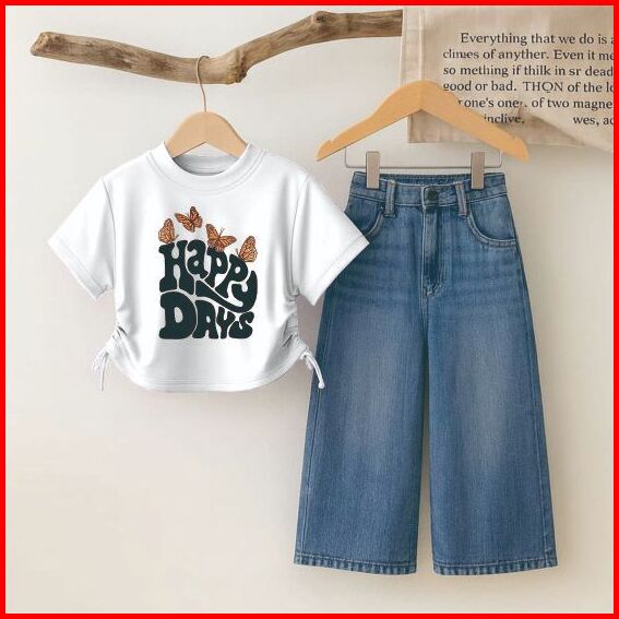 Setelan Anak Perempuan Terbaru Kekinian Bahan Kaos Katun Adem Model Serut Samping Dan Celana Kulot Jeans Denim. Set Baju