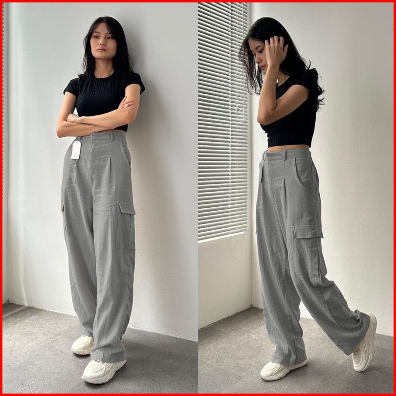 Zayida - Celana Cargo Wanita Linen - Cargo Pants Wanita - Cullote Loose Cargo Highwaist Big Size