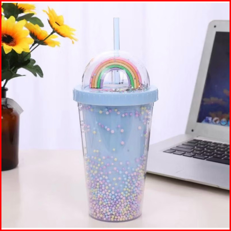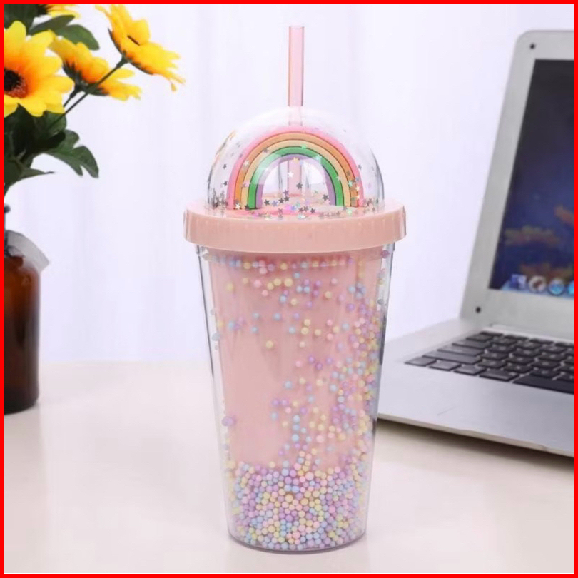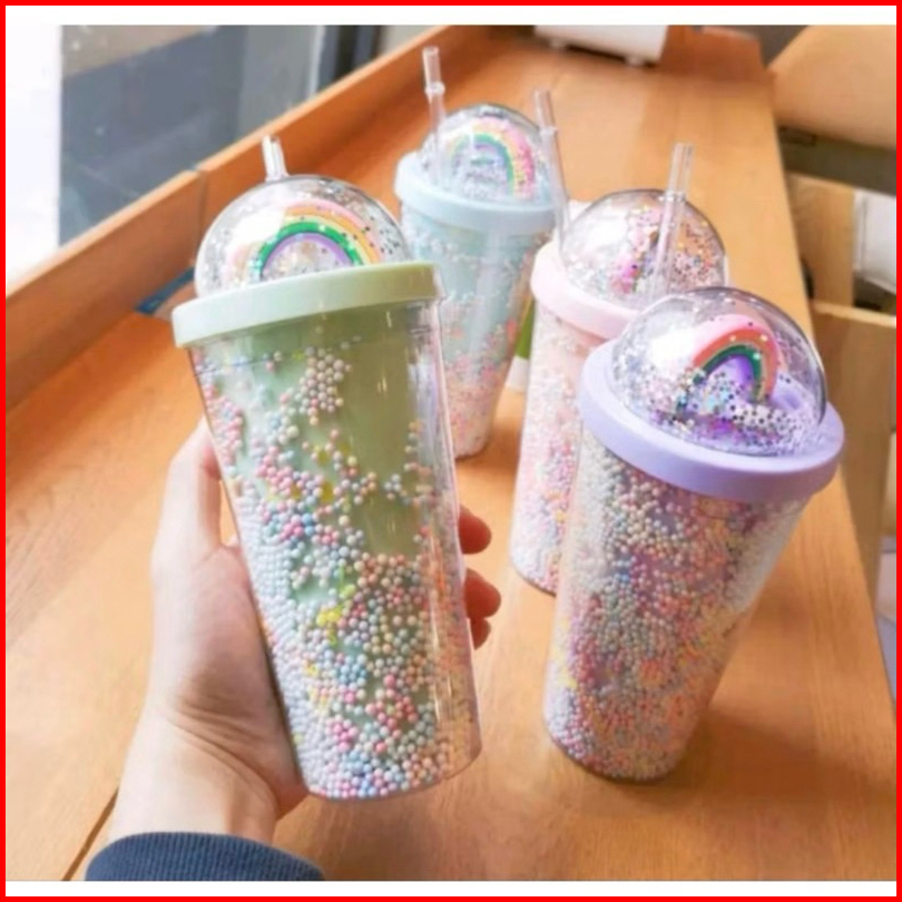 Botol Minum Tumbler Glitter Rainbow Pelangi Foam 550ml Tumbler Gelas Cantik Unik Kado Lucu
