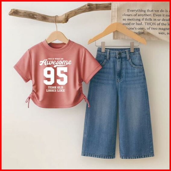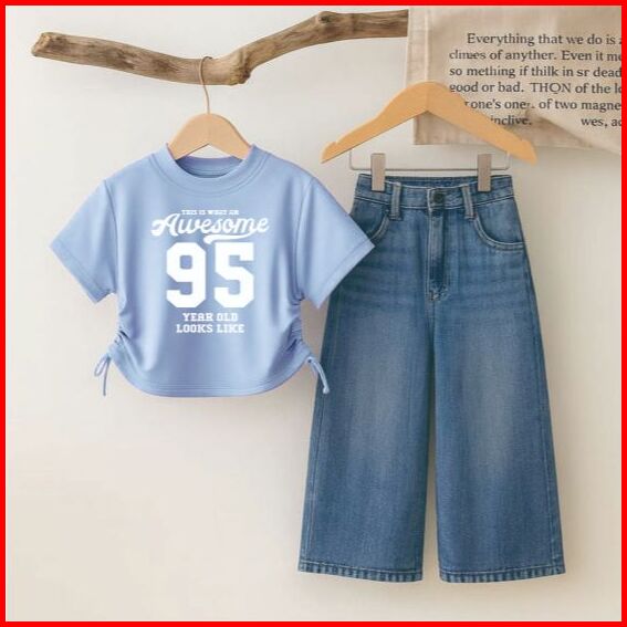 Setelan Anak Perempuan Kaos Awesome 95 Serut Samping Dan Celana Jeans Kulot Baju Ootd Anak Cewek Kekinian Usia 1-12 Tahu