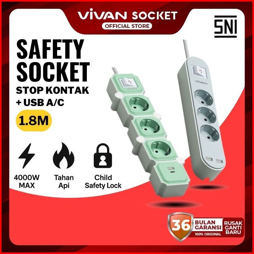Vivan Safety Socket Stop Kontak Kabel 1.8 Meter Dengan 3-6 Lubang Usb A Type C Adaptor Steker Power Strip Vps-h Pro Seri