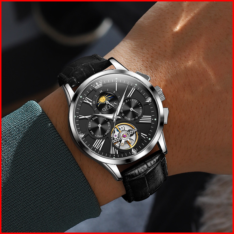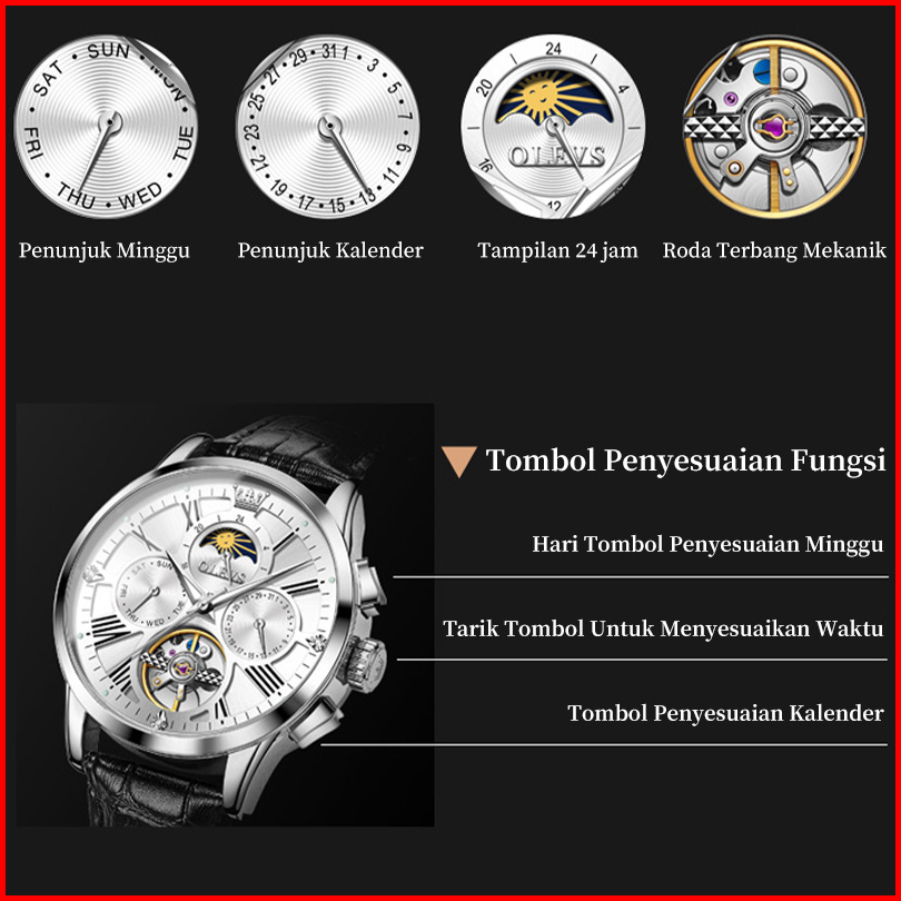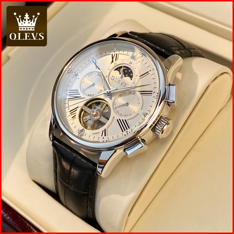 Olevs Jam Tangan Automatic Pria Original Anti Air Kulit Tahan Keren Led Hitam Coklat Putih Multi-function Ventilasi Luxu
