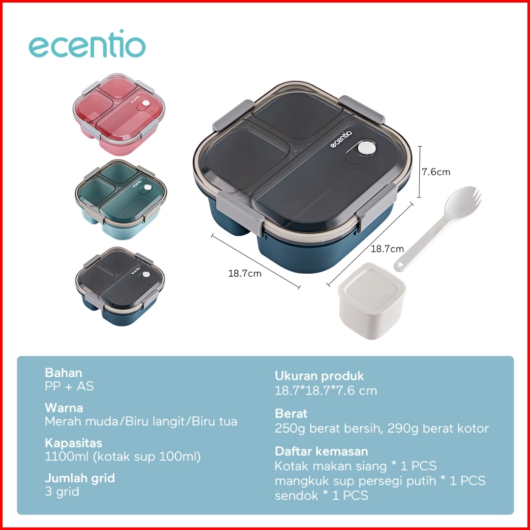 Ecentio Foodi Kotak Makan Set 3 Sekat 1100ml 100ml Tempat Makan Anak Biru