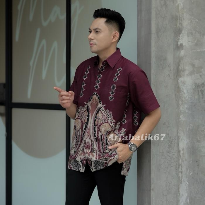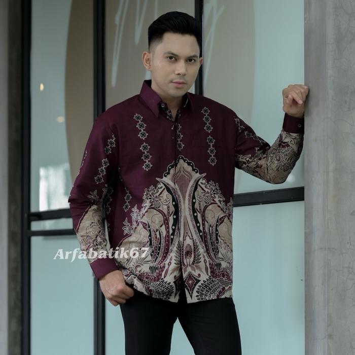 GUNUNGAN BURGUNDY Kemeja batik katun pria tangan panjang dan tangan pendek lapis furing hero