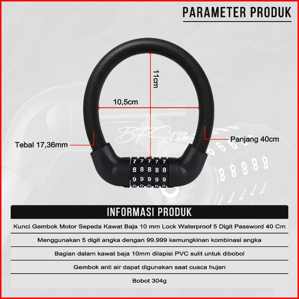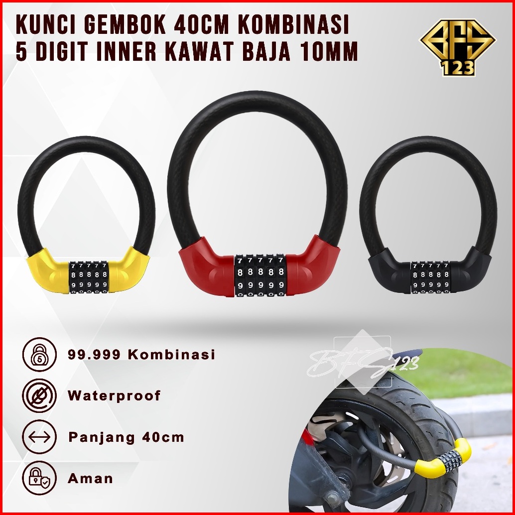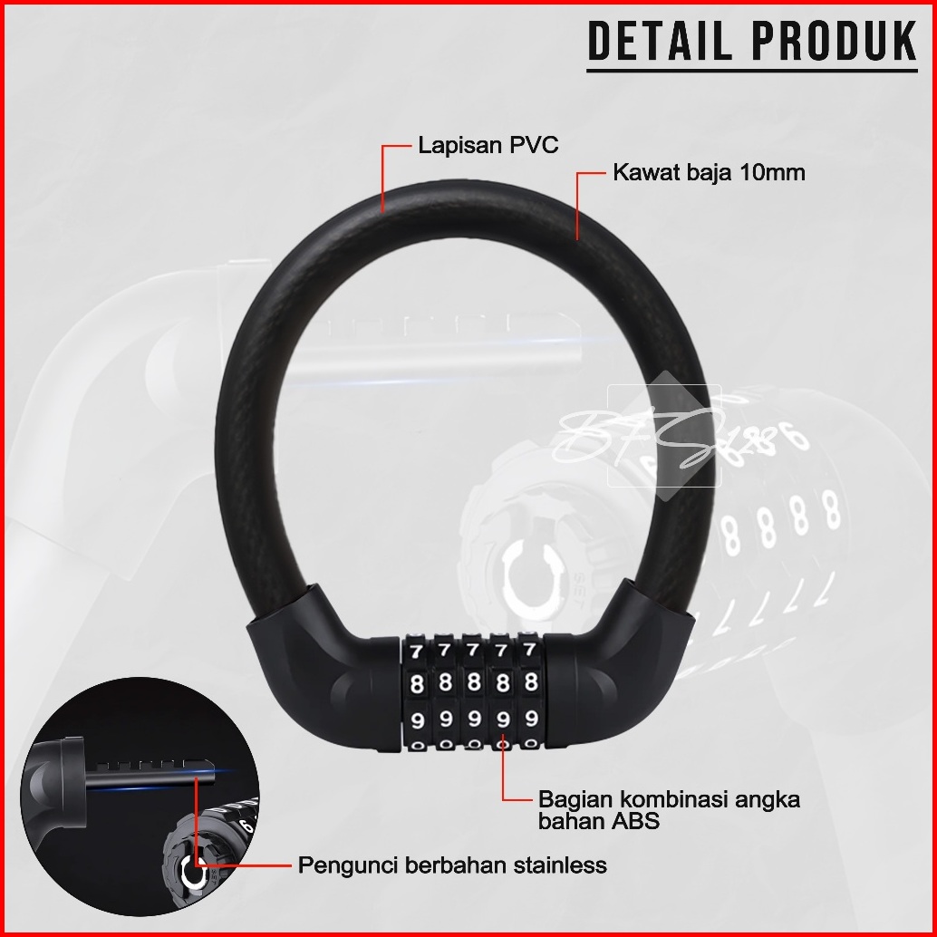 Kunci Gembok Motor Sepeda Kawat Baja 10 Mm Lock Waterproof 5 Digit Password 40 Cm