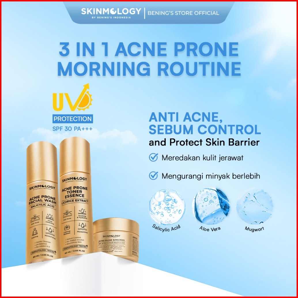 Skinmology By Bening S Clinic Indonesia - Paket Morning Acne Prone Expert Series - Sunscreen - Sabun Muka Face Wash - To