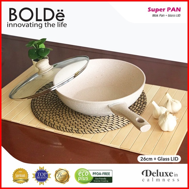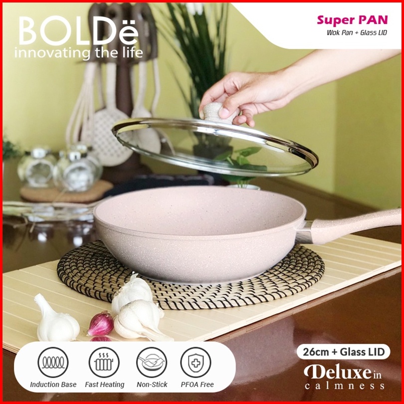 Bolde Panci Super Pan Wok 26 Cm Tutup Kaca Lid Glass Granite Beige