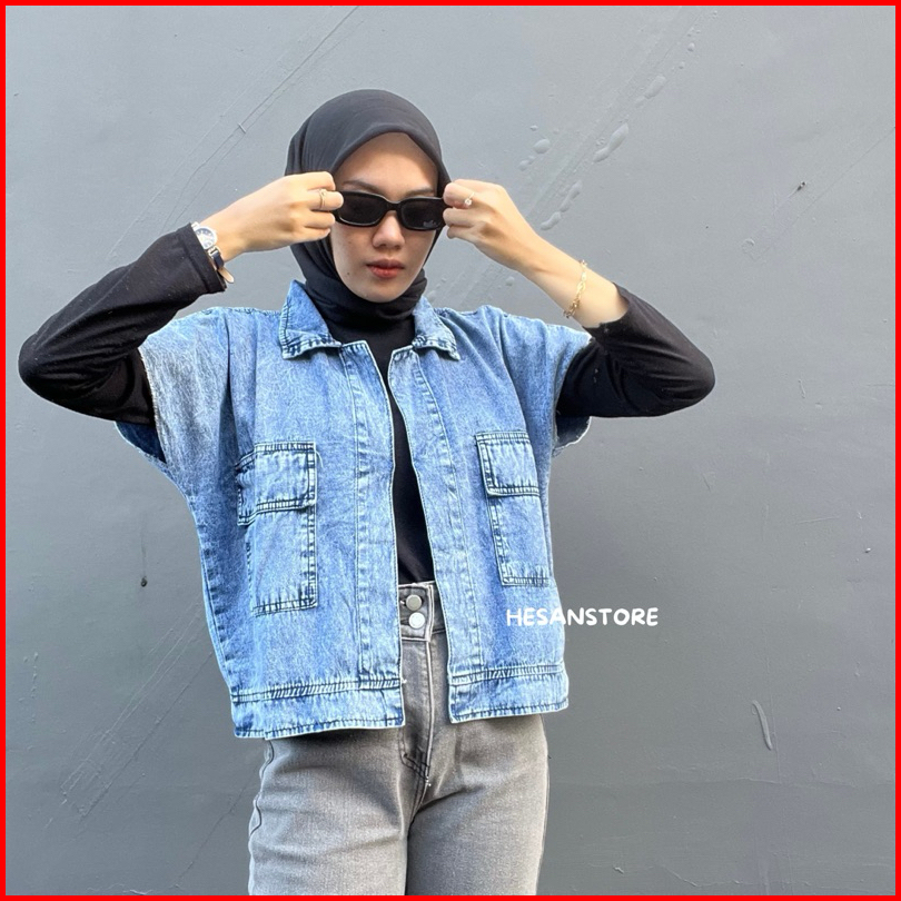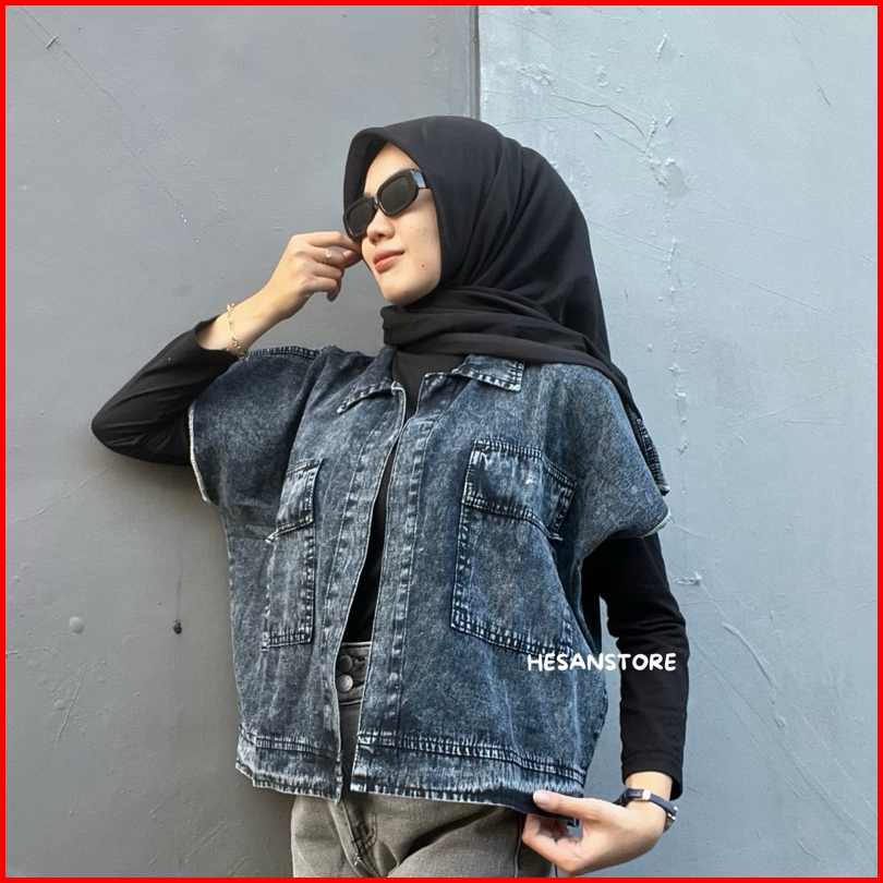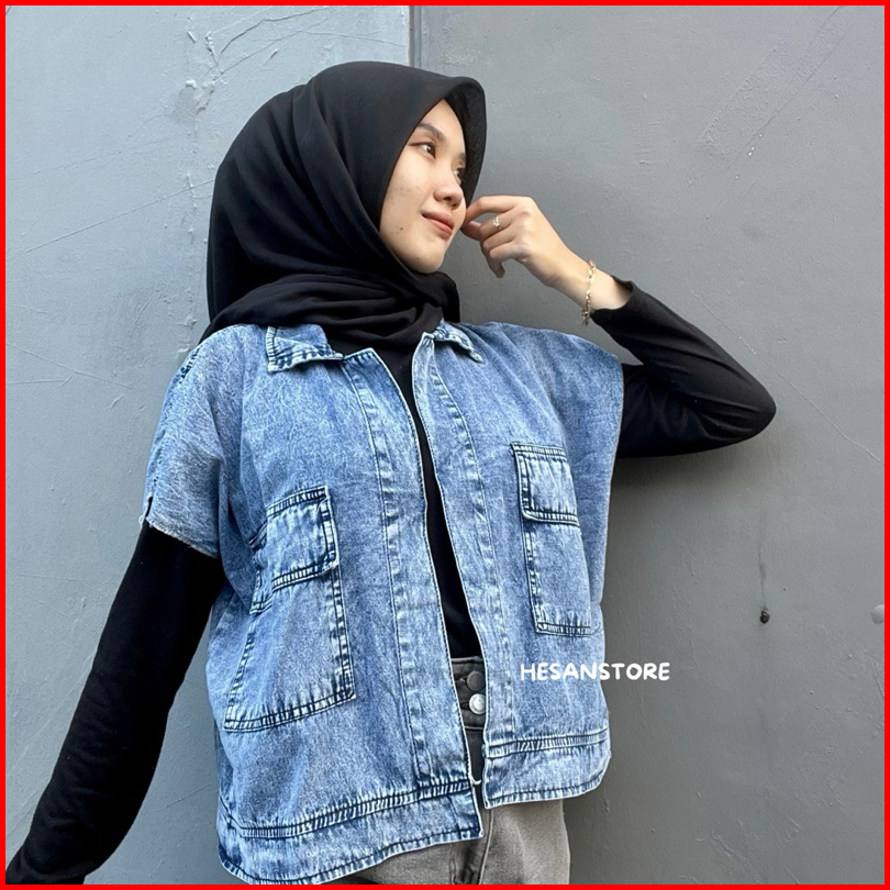 Jaket Rompi Jeans Cassandra Oversize Vest Outer Jaket Denim Wanita Panjang Tanpa Lengan Kain Lembut Dan Lentur Ld 120