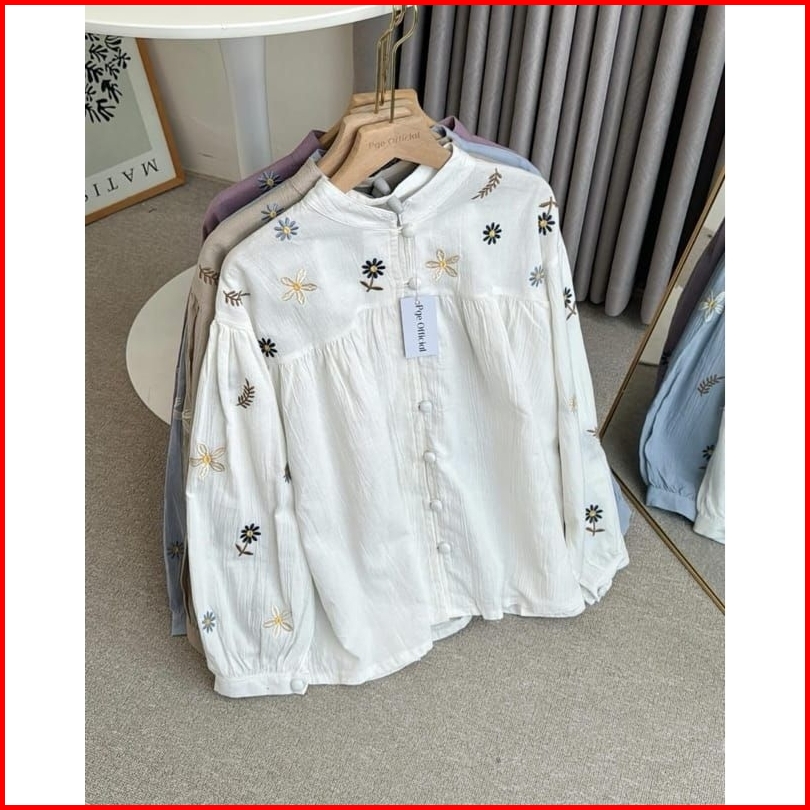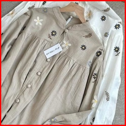 Davina Blousee Baju Atasan Wanita Elegant Motif Bordir Bunga Rempel Bahan Katun Linen Cringkel Premium Quality