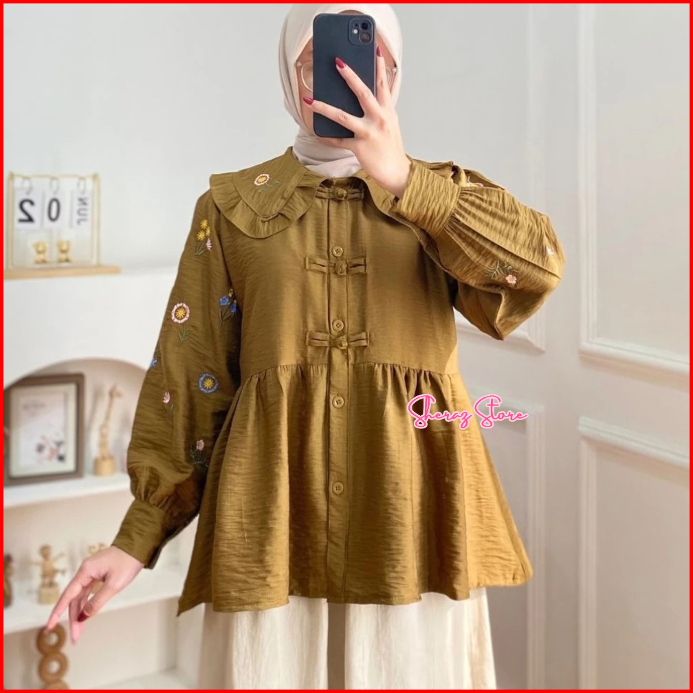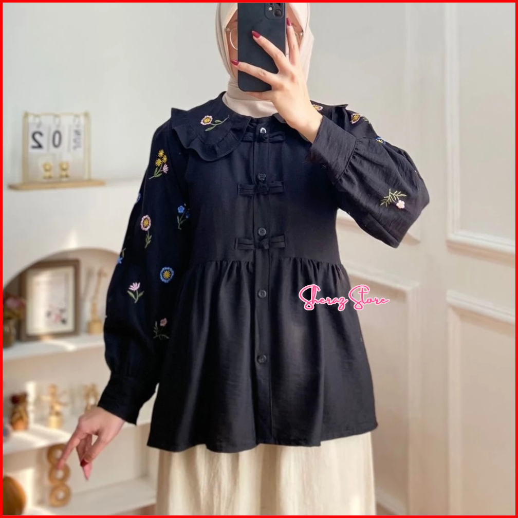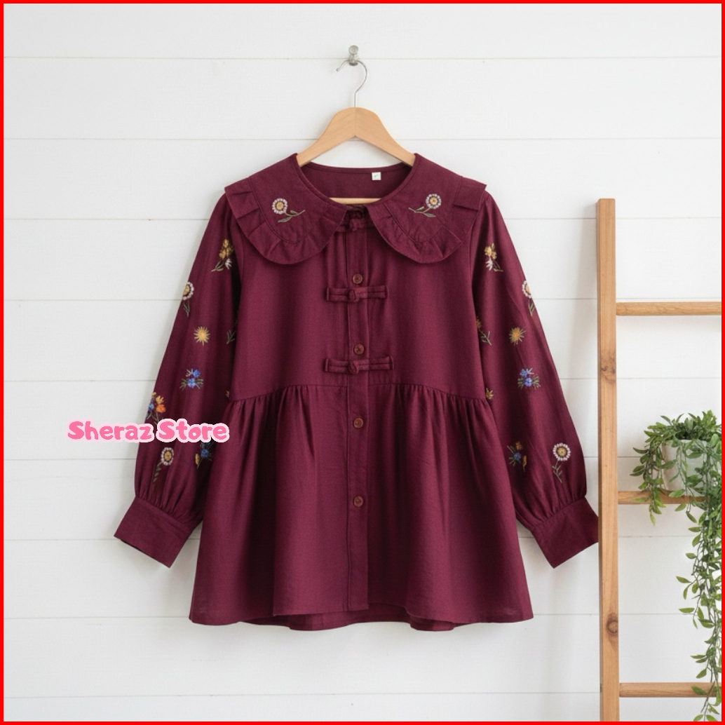 Meilyn S M L Xl Xxl Baju Atasan Blouse Wanita Linen Bordir Korean Style Kekinian Jumbo Ld 120 - 92 Burgundy Hitam Mocca
