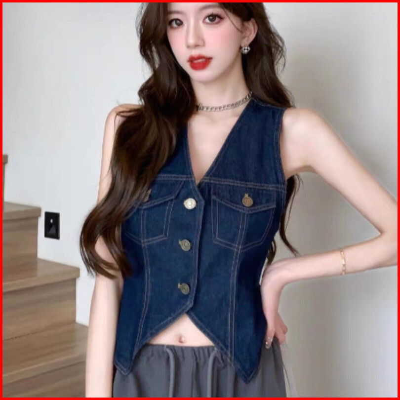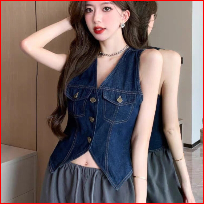 Ready Jinsen Rompi Denim Gaya Hong Kong Retro Untuk Wanita Atasan Kardigan Pendek Ramping Tanpa Lengan Kerah V Keinginan