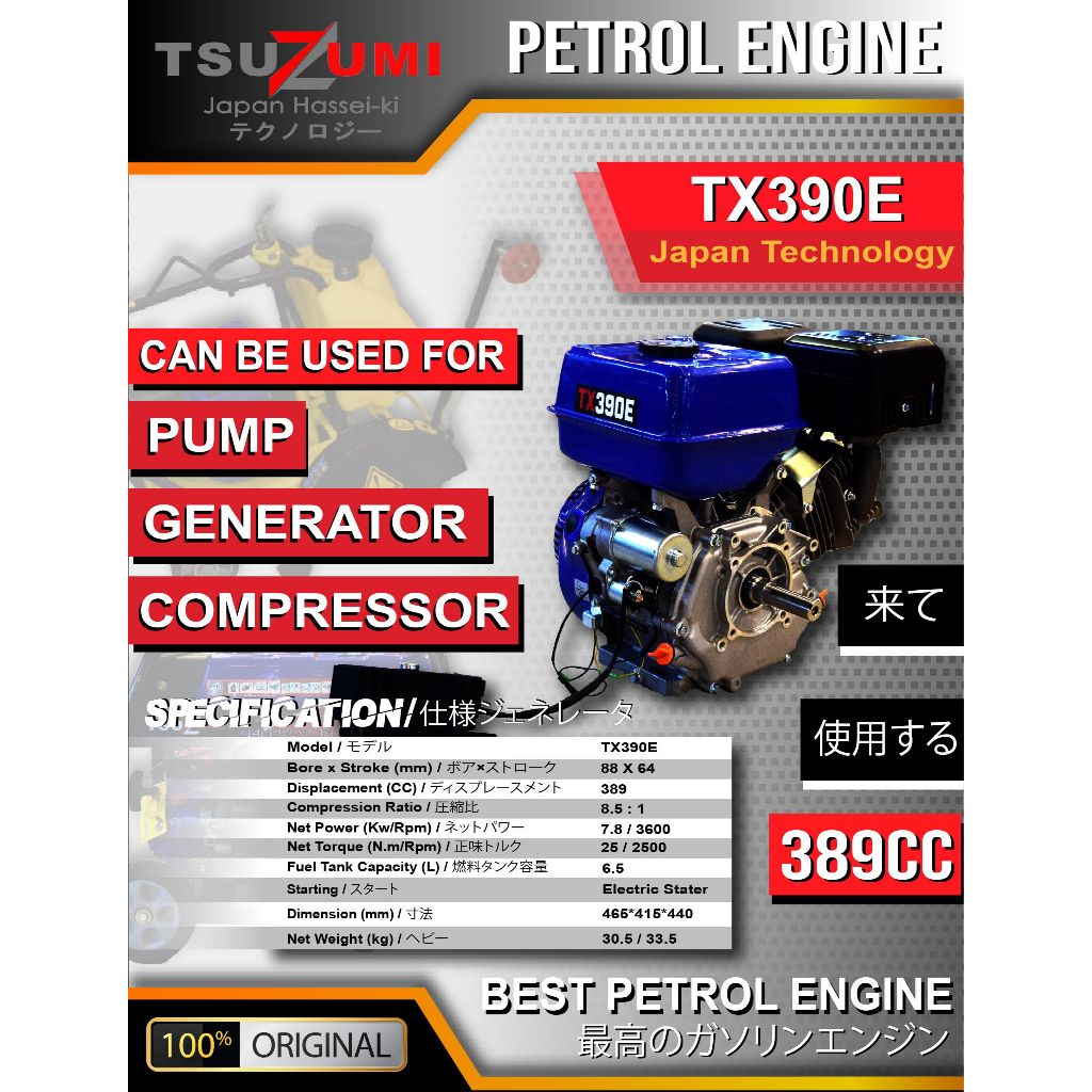 Tsuzumi Mesin Penggerak Bensin PORTABLE REFFIoline TX200A TX390E TX500 / Petrol Engine Untuk Kompresor