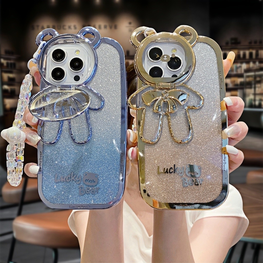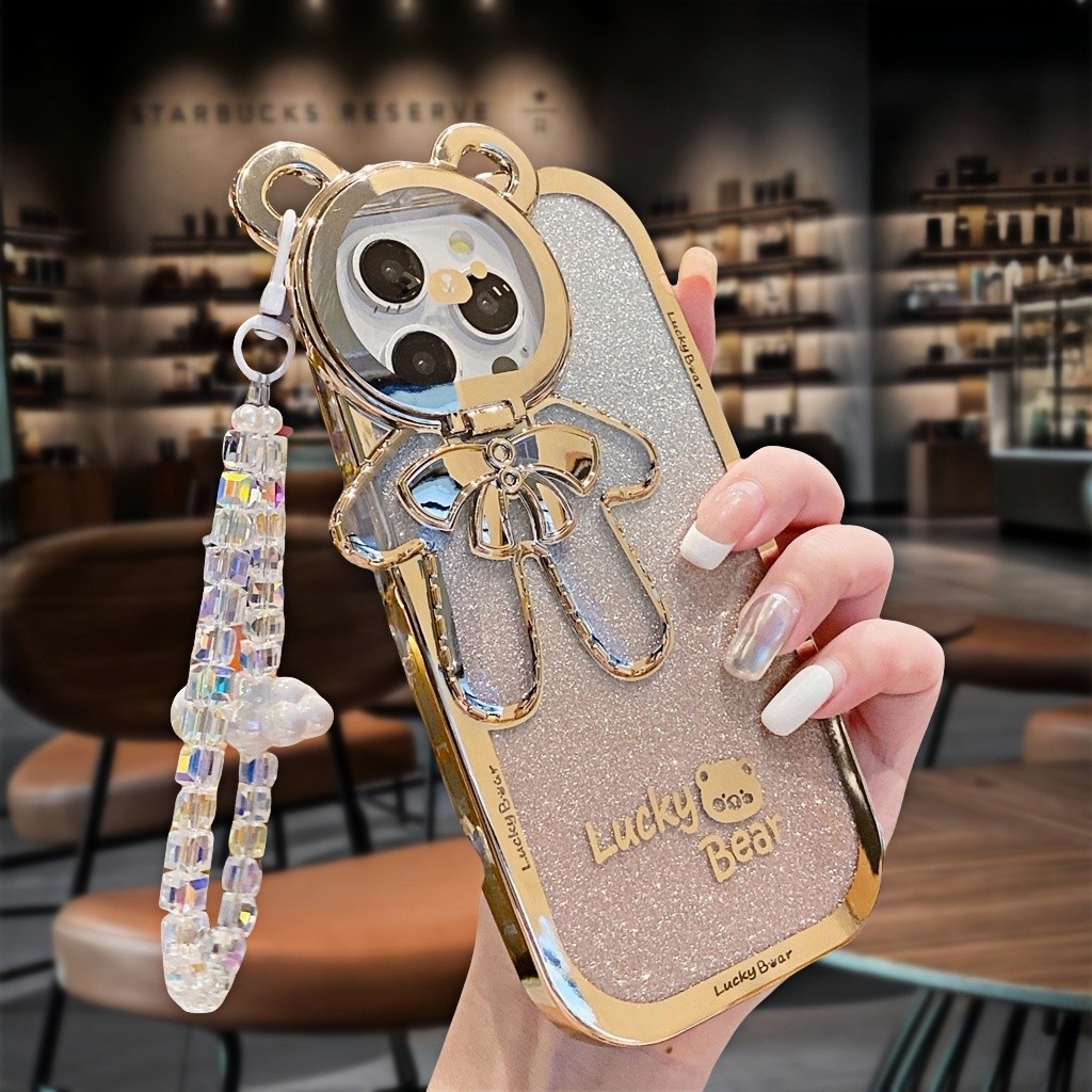 Glitter Bear Phone Case for iPhone 14 15 ProMax 13 12 11 Pro Max 7 8 Plus Xr Xs Max Colored Bracelet Bear Ears Shockproof Cover With Lens Camera Protection