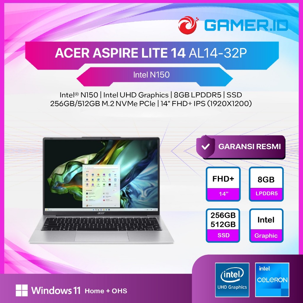 ACER ASPIRE LITE AL14 N150 8GB 256GB / 512GB W11+OHS+M365B 14.0WUXGA PINK / BLUE / SILVER