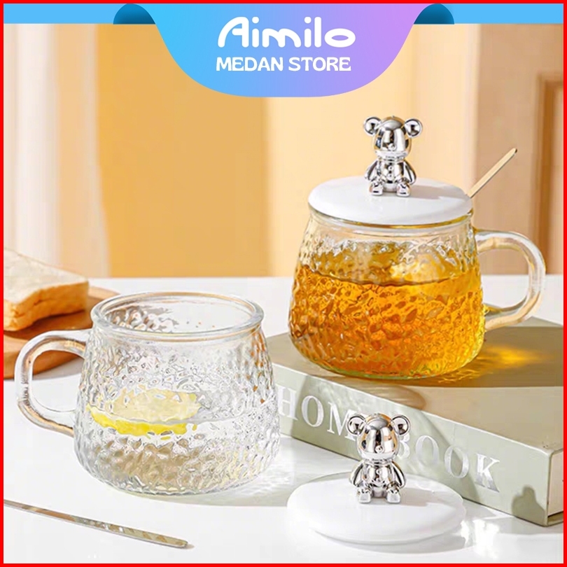 Aimilo - Gelas Kaca Mug Tutup Beruang Dengan Seddok Elegan Water Bottle Cup For Coffee-tea