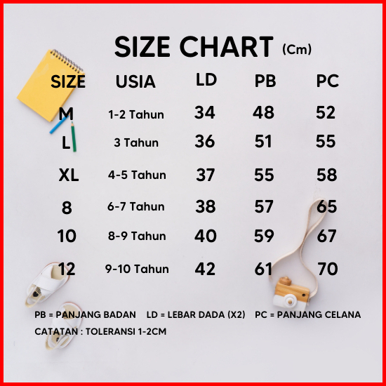 M (1-2 Tahun), L (3 Tahun), XL (4-5 Tahun), Size 8 (6-7 Tahun), Size 10 (8 Tahun), Size 12 (9-10 Tahun)