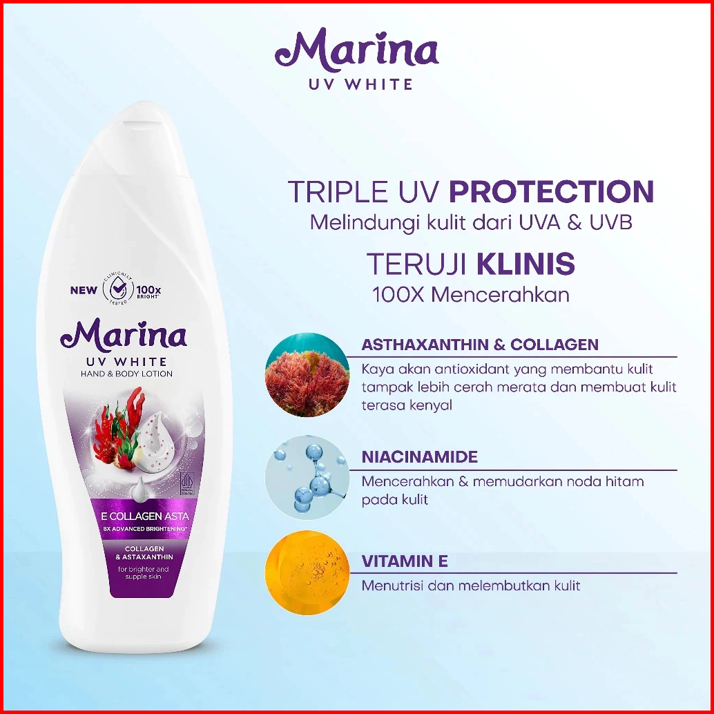 Marina Hand Body Lotion Uv White 185ml - Nourish Bright Healthy Glow Dewy Bright E Collagen Asta