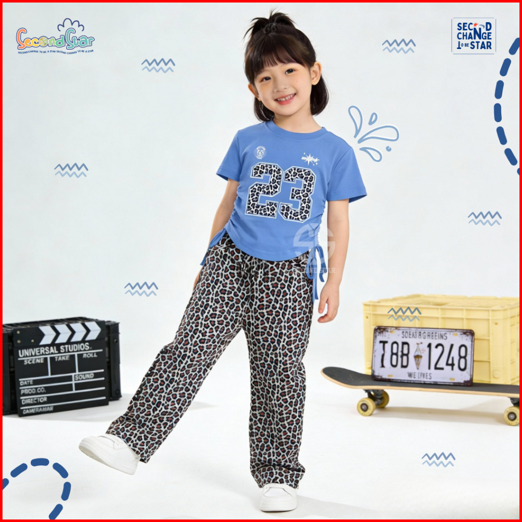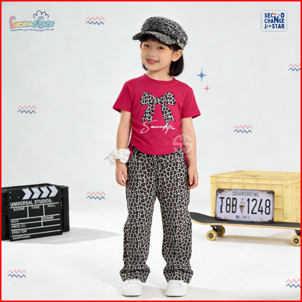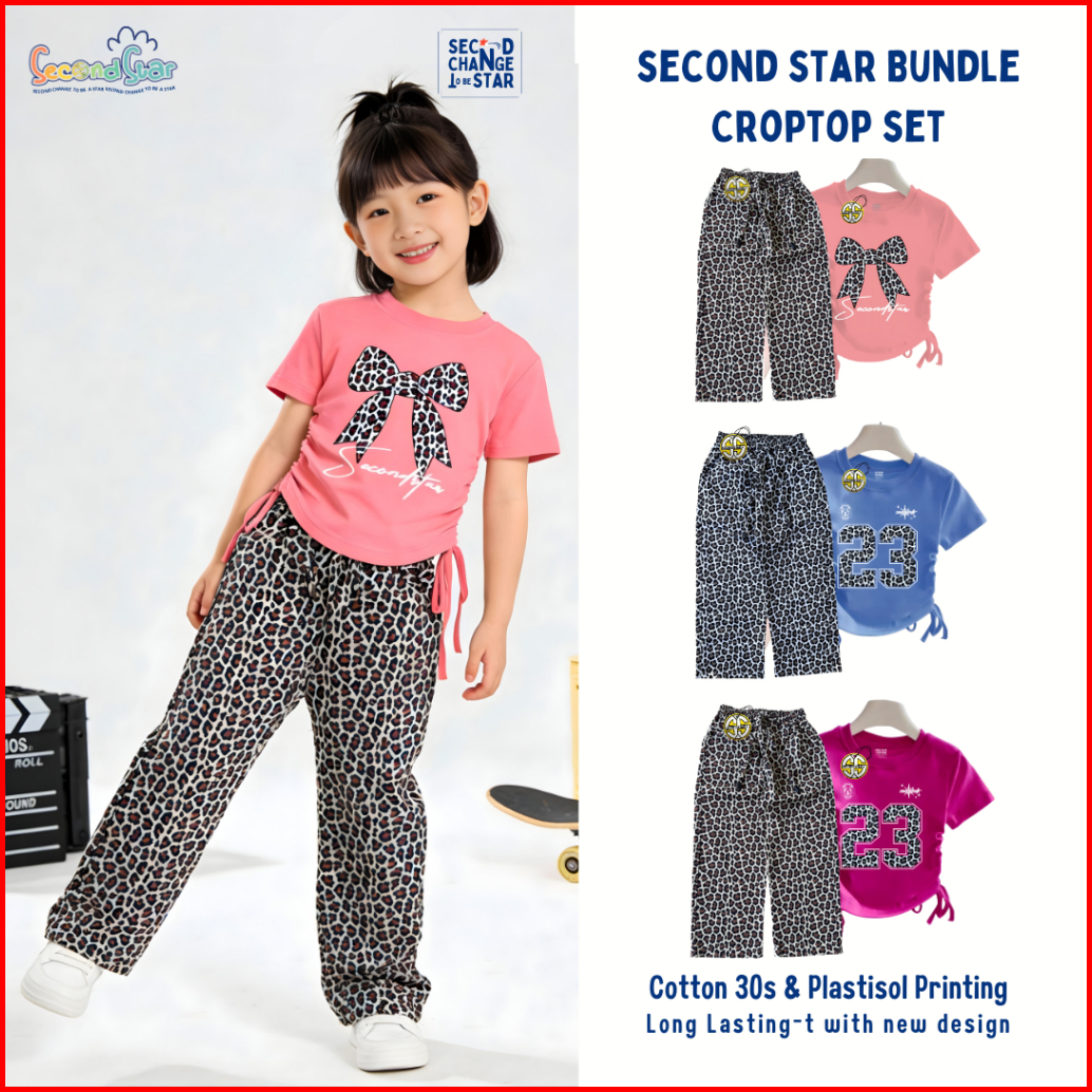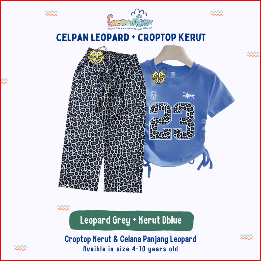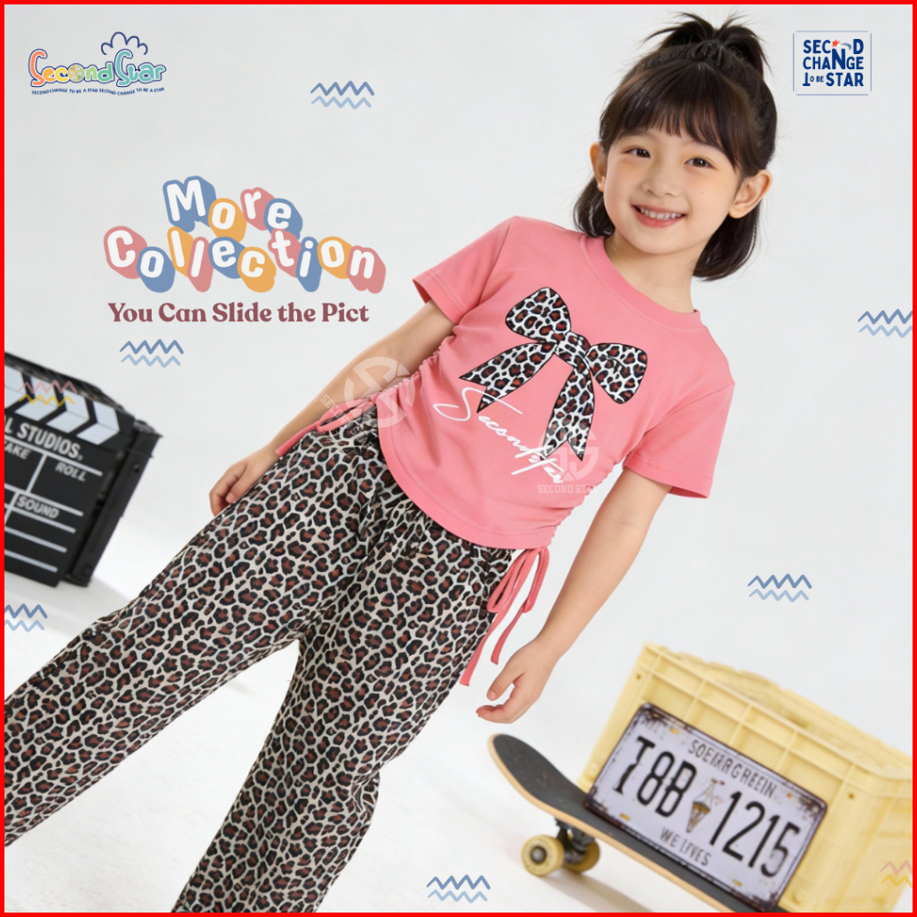 Secondstar Setelan Anak Perempuan Kaos Croptop Kerut Celana Panjang Leopard Usia 5-10 Tahun- Ssb39