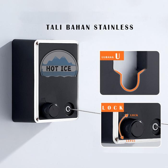 Jemuran Baju Portable Indoor Outdoor Retractable Tali Clothesline Bahan Stainless - hitam