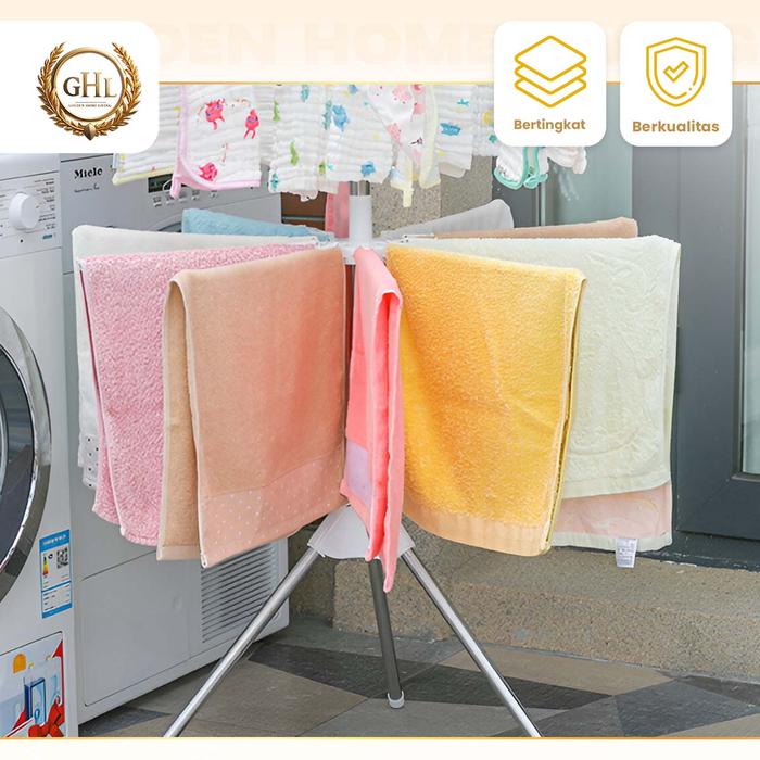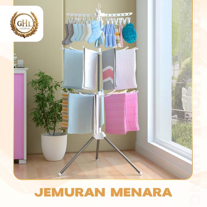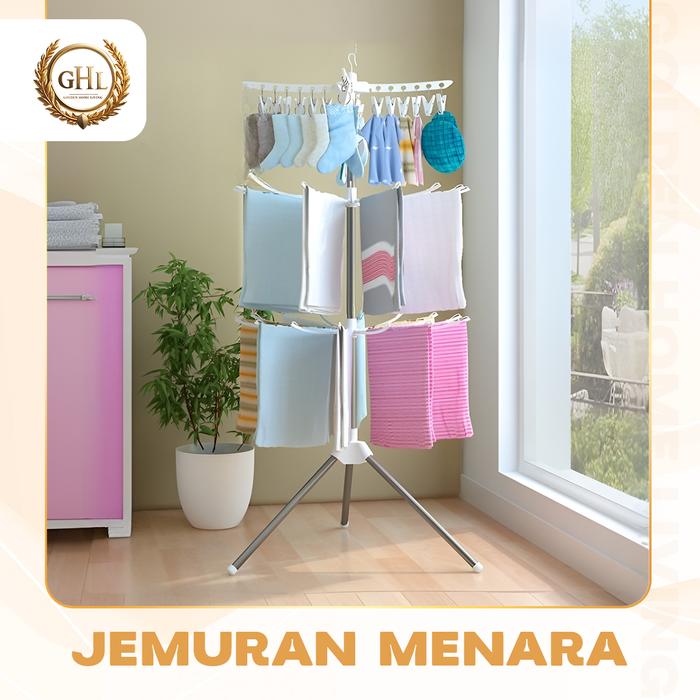 GHL - Jemuran Baju Menara 3 tingkat Gantungan Pakaian Besi Stainless & Gantungan Plastik PP - WHITE