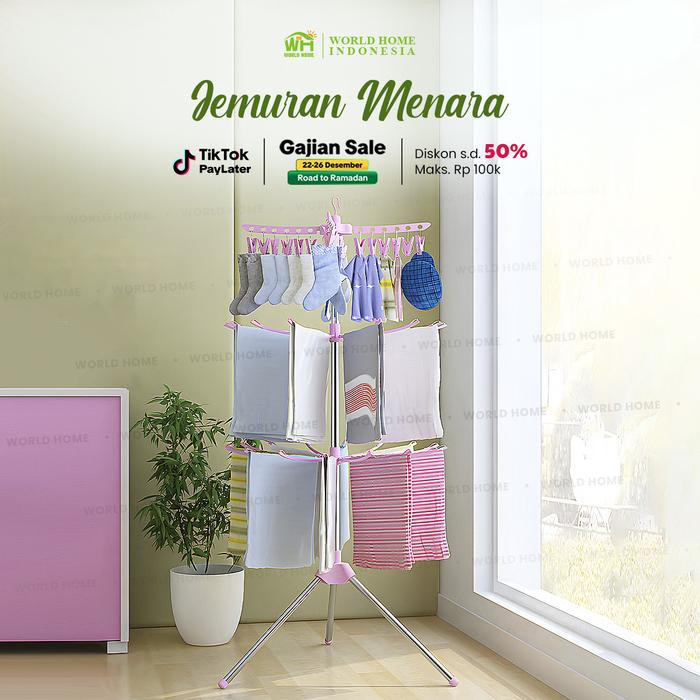 WORLDHOME - Jemuran Menara 3 Tingkat Jemuran Pakaian Multifungsi Bisa Lipat Jemuran Baju [01] - PINK