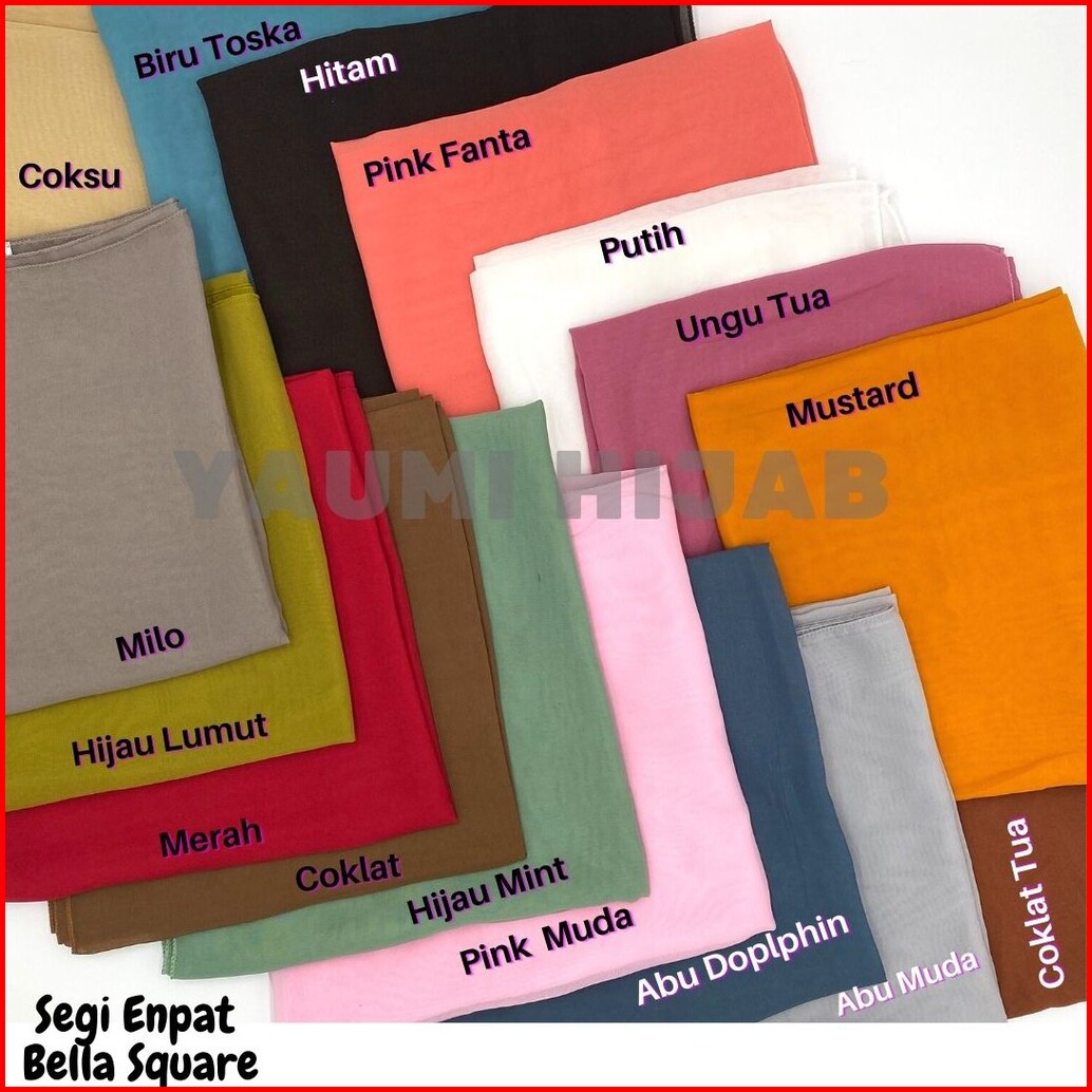 Ungu Tua, Hitam, Abu-abu Muda, Abu Dolphin, Putih, Pink Muda, Biru BCA, Lemon, Pink Fanta, Army Tua, Abu Tua, Milo, Biru Toska, Hijau Lumut, Merah, Coklat Susu, Mustard, Biru Langit, Random, Lilac, Wardah, Mint, Salem, Navy, Maroon, Kunyit, Coklat Pramuka, Hijau Botol, Mocca, Pink Tua