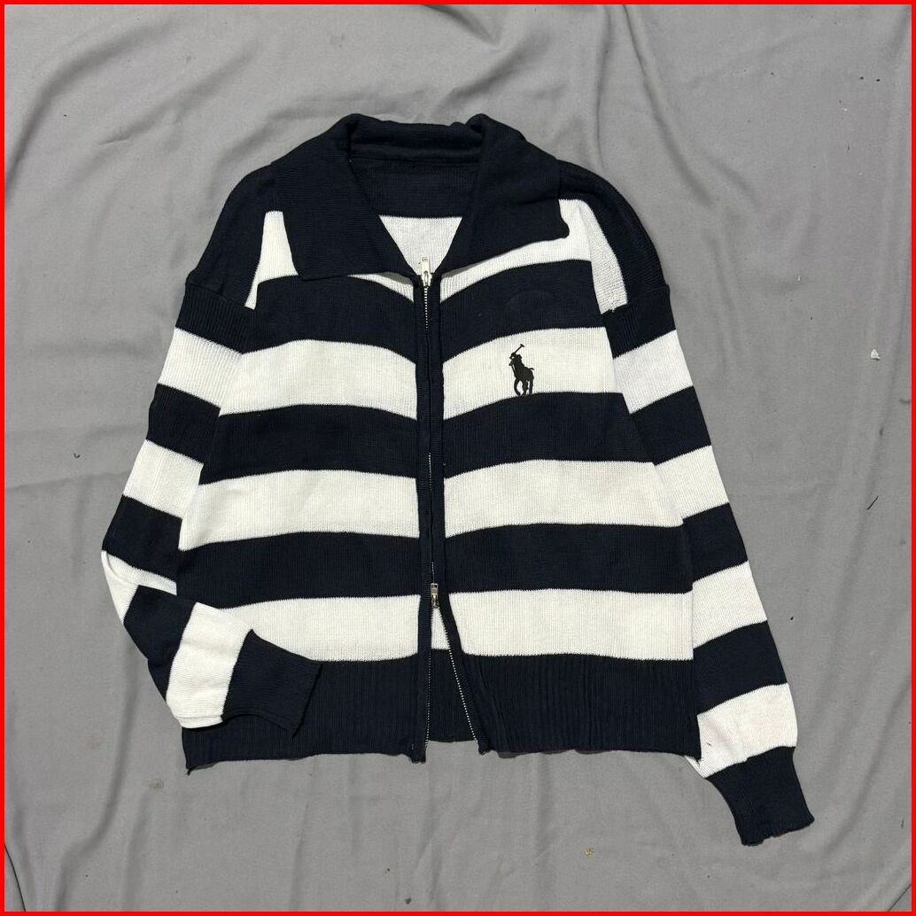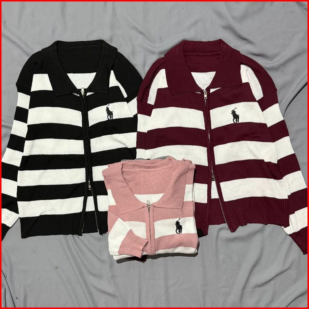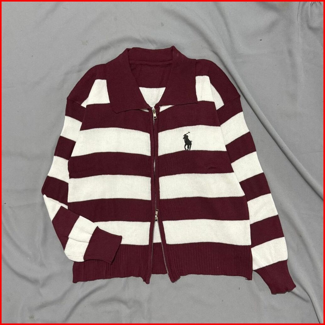 Sweater Cardigan Rajut Double Zipper Salur Olop Berkerah Premium Bahan Adem