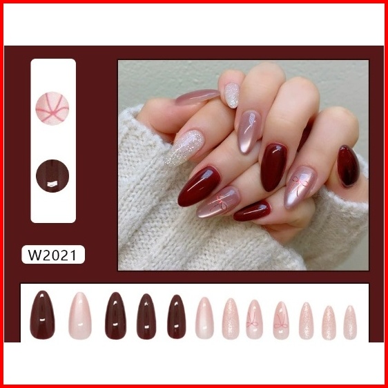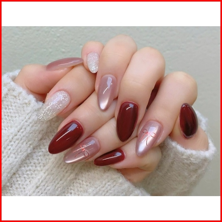 Kuku Palsu Press On Nails Cat Eye Bow Silky Premium Red Pita Silver Cantik Lengkap Dengan Lem Dus