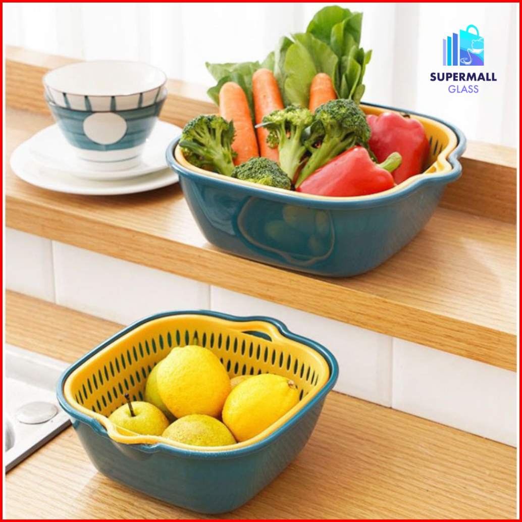 Supermall Glass Keranjang Saringan Wadah Cuci Buah Sayur 2 Layer Baskom Set Tempat Tirisan Sayuran Double Layers Portabl