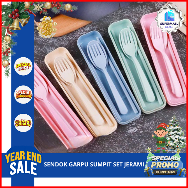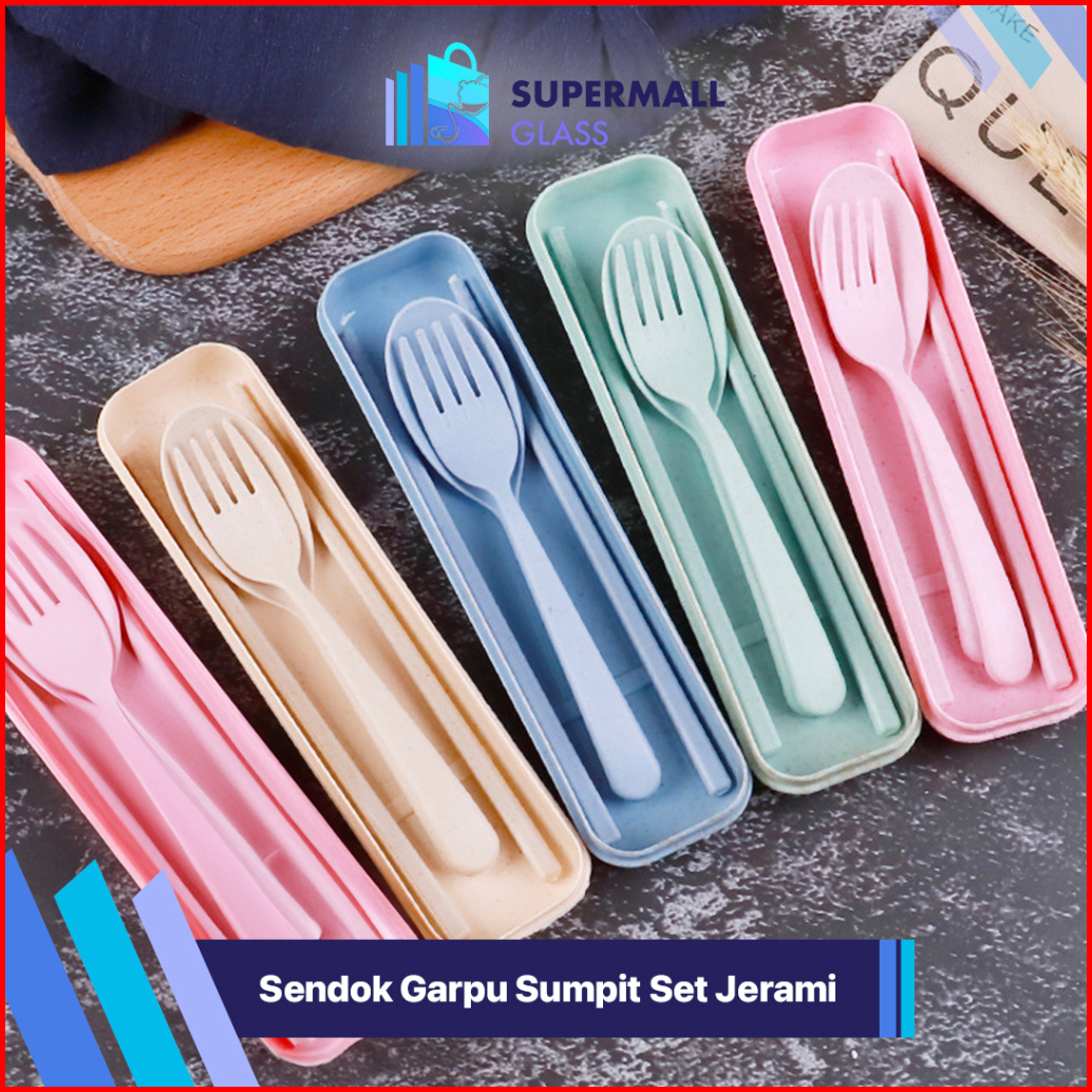 Supermall Sendok Garpu Sumpit 3in1 Travel Cutlery Set Alat Makan Set Korea Bahan Jerami Gandu