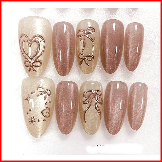 Kuku Palsu Cat Eye Pink Soft Motif Love Silver Oval Almond Free Lem