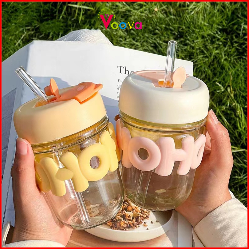 Voova Cangkir Gelas Ganda Sedotan Bermotif Cute Paragraph 350ml Gelas Lucu Cangkir Mug Gelas