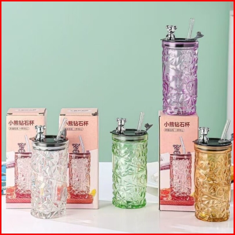 Voova Gelas Kaca Tumbler Kaca Aesthetic Bear Lid Glass Gelas Kaca Borosilicate Tinggi Cangkir Minuman Cangkir Kopi